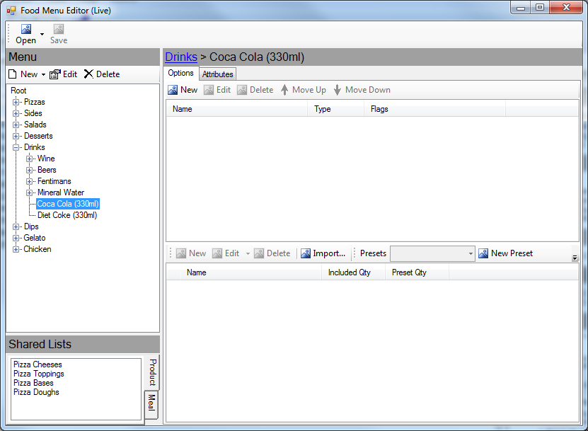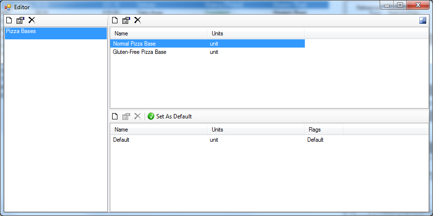 The leftmenu listeditor areprovides groupsa ortool categories.to The top list onsimplify the rightprocess areof associating food and drink with stock, called the itemsStock withinAssociation that category. The bottom list on the right are varieties of that item. Varieties are different 'types' of the same item. For example, you might have 'Tomato Pizza Sauce' as an item, but you sometimes buy different brands from different suppliers in different quantities. Varieties do not represent different types of item, such as tomato sauce and BBQ sauce - these should be distinct items. There must always be at least one variety of every item, but most of the time it is sufficient to add a 'default' variety.Wizard: