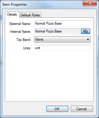 Click the button to choose the stock item to associate with the food item. In the example, 'Normal Pizza Base' was selected. Enter a quantity of the selected stock item to be consumed for every food item sold. The quantity should be in the units you set up when you created the stock item. For example, if we were associating stock with a pepperoni pizza topping, the topping stock item was set in 'kg' units, and you wanted 100g to be used each time the food item is sold, enter '0.1'.