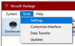 To add the device in Vantage, go to the 'Tools' menu and select 'Settings':