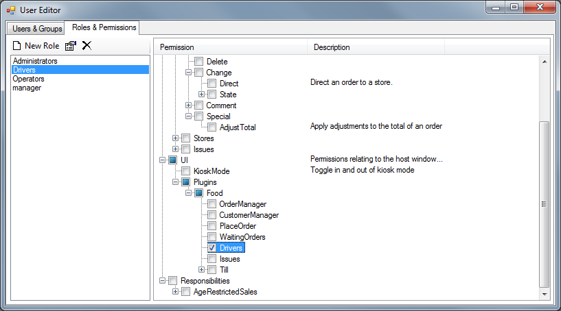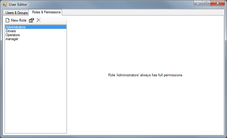 The list on the left shows the created roles. You can add, edit and remove roles using the toolbar buttons above the list. Select a role to view its permissions