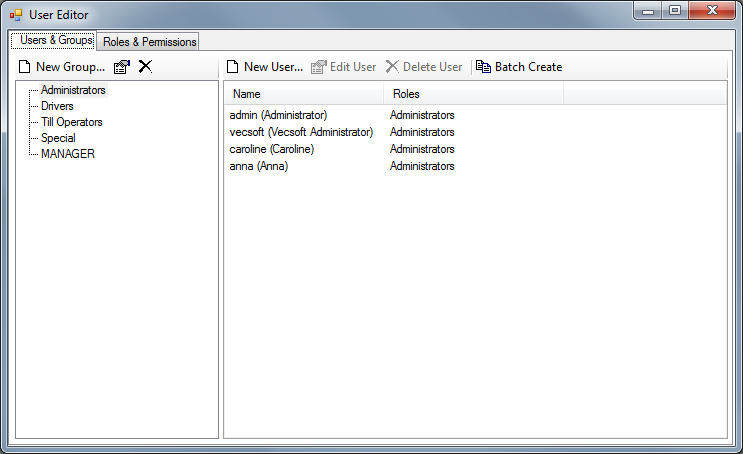 On the left side, you can see the user groups. These are used to group users into logical divisions, but have no effect on the Vantage and are not used to control permissions. You can add, edit and remove user groups using the toolbar buttons above the list.