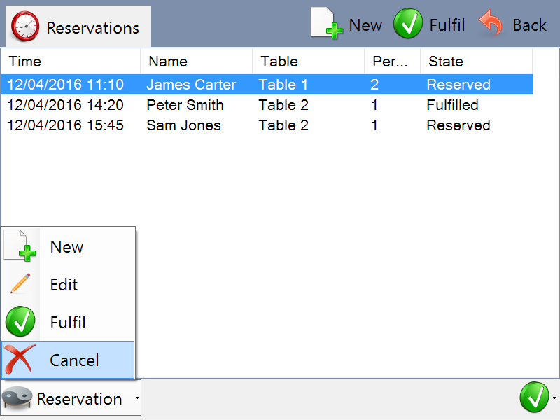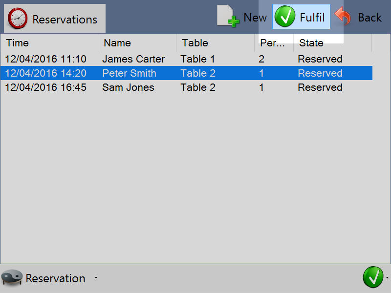 When a customer with a reservation arrives, enter the 'Manage Table Bookings' screen as shown in the first step. Locate the customer's reservation in the list, and then press the 'Fulfil' action button in the top right of the screen: