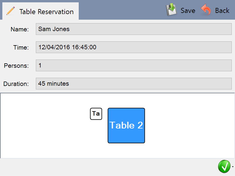 When all values are entered, press the 'Save' action button in the top left to save the reservation. You can cancel by pressing 'Back' instead, which returns to the previous screen without saving the new reservation.