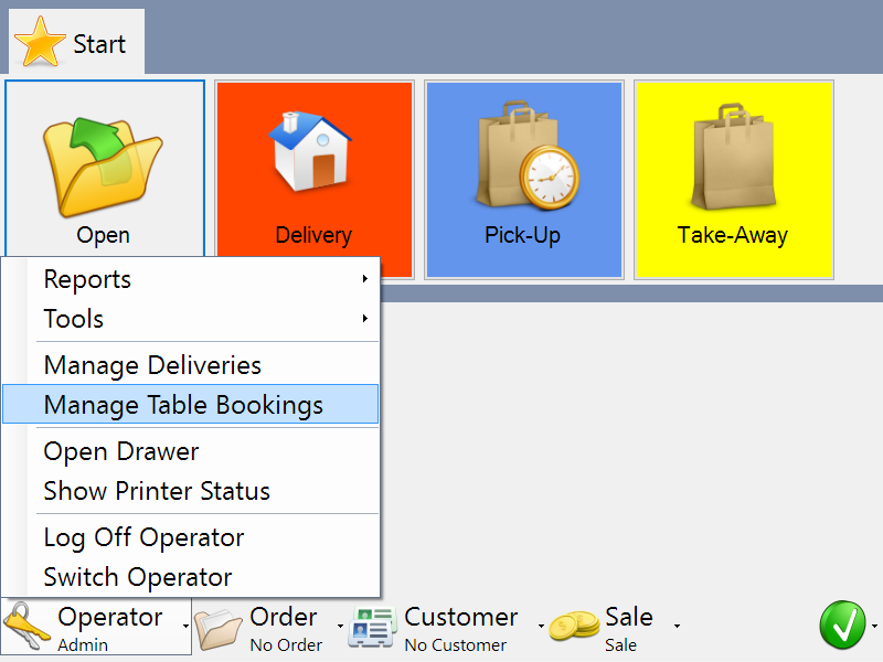 The till includes facilities for managing table bookings. To access the bookings screen, select 'Manage Table Bookings' from the operator menu, as shown below: